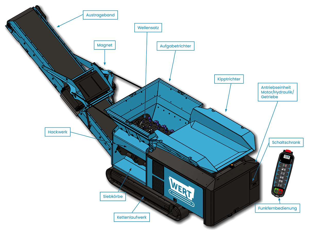 Der multifunktionale Shredder besitzt ein revolutionäres Wellen-Schnellwechselsystem sowie ein Werkzeugwende-System. Diese Systeme ermöglichen einen schnellen, unkomplizierten und wartungsarmen Austausch der Werkzeugwellen für den jeweiligen Einsatzbereich.